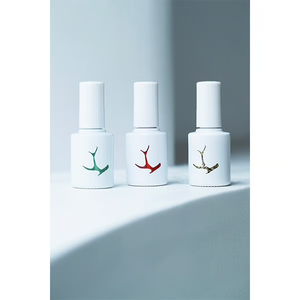 The second collaboration is with the jewelry brand "PLUIE". The request was for a color created from the colors surrounding PLUIE's environment. The nail bottle features PLUIE's icon, the antler mark. There are three colors in total.